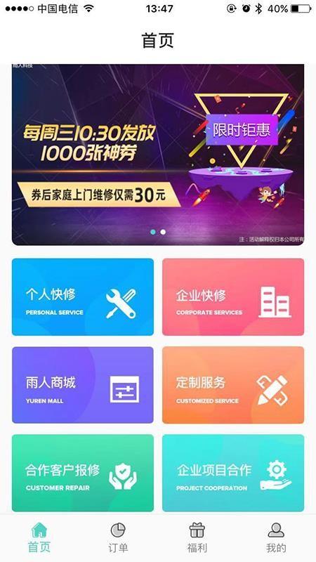 1、应用中有个人快修服务,帮助个人用户快速维修各种故障,方便快捷;